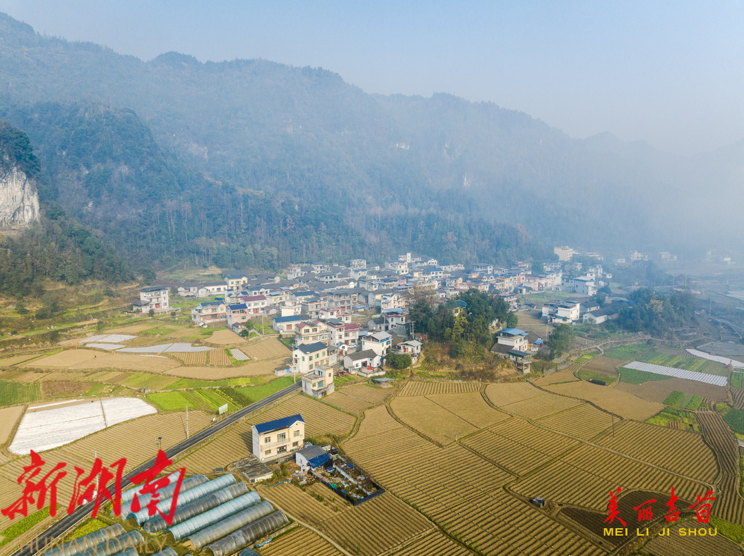 2025年1月5日,吉首市乾州街道西门口村,错落有致的村庄与晨雾、群山、田园交相辉映,构成了一幅冬日里的美丽乡村画卷。