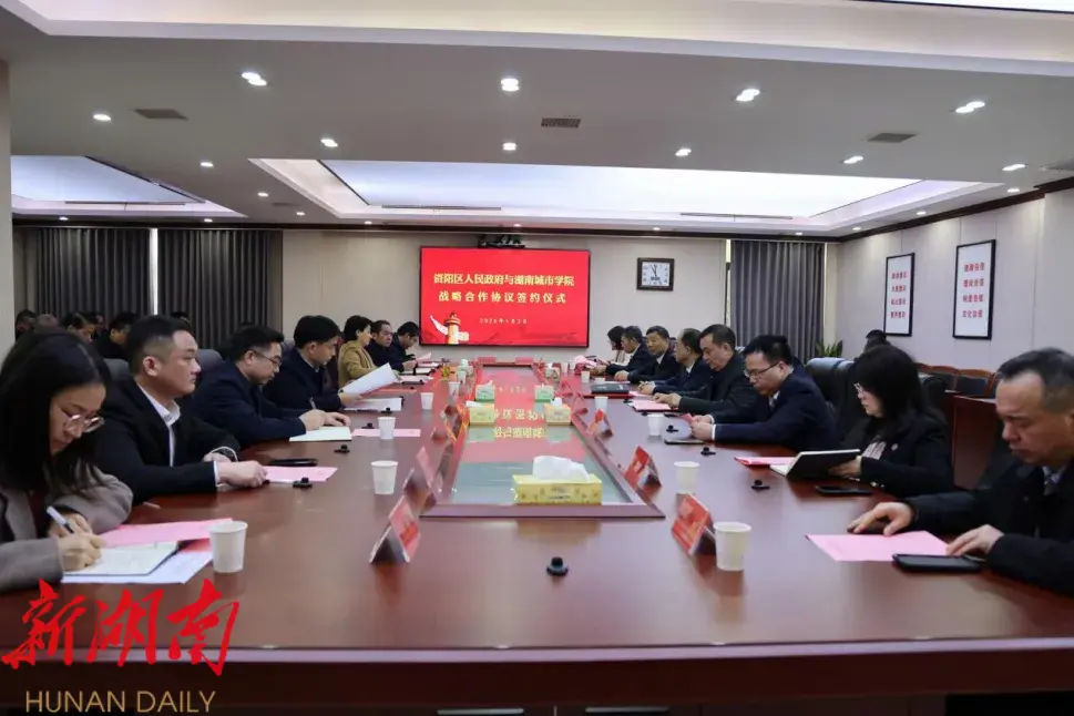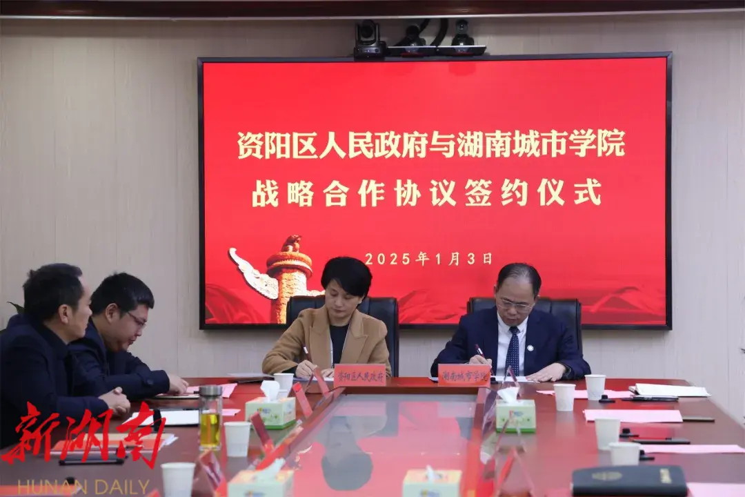 1月3日,资阳区人民政府与湖南城市学院战略合作协议签约仪式举行。湖南城市学院党委副书记、校长何振,校领导雷存喜、谭献良、袁志成、陈列尊、徐姝、孙倩、吕贤军出席,区委副书记、区长黄瑛出席并致欢迎辞,区委副书记、区委统战部部长张辉主持会议,区领导李良兵、贺江华、万巍、黎浩、莫李丽及相关负责人、学院相关工作人员参加签约仪式。