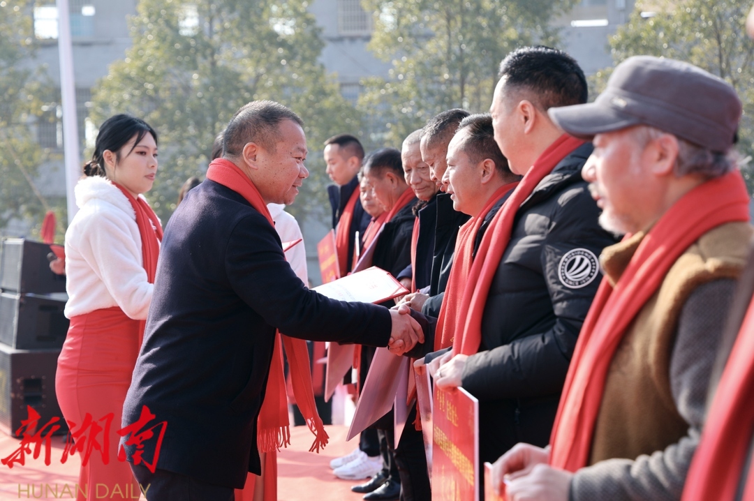 各界贤达、各村依次向潭府教育促进会认捐,共筹集善款416.8万元。朱有志、李繁荣为部分贤达代表颁发捐赠证书。著名艺术家刘铁臂先生展示了原湖南省副省长唐之享为潭府教育促进会题写的《行稳致远》墨宝,并捐赠个人美术作品。随后,会议宣读了教育促进会第一届理事会人员名单。李波当选首任会长。他表示,将牢记使命,与理事们共同努力,秉承“捐好款、管好人、用好钱”的宗旨,激发社会各界爱心,打造专业团队,确保资金透明高效使用,让教育促进会不断发展壮大,激励更多学子追梦前行。
