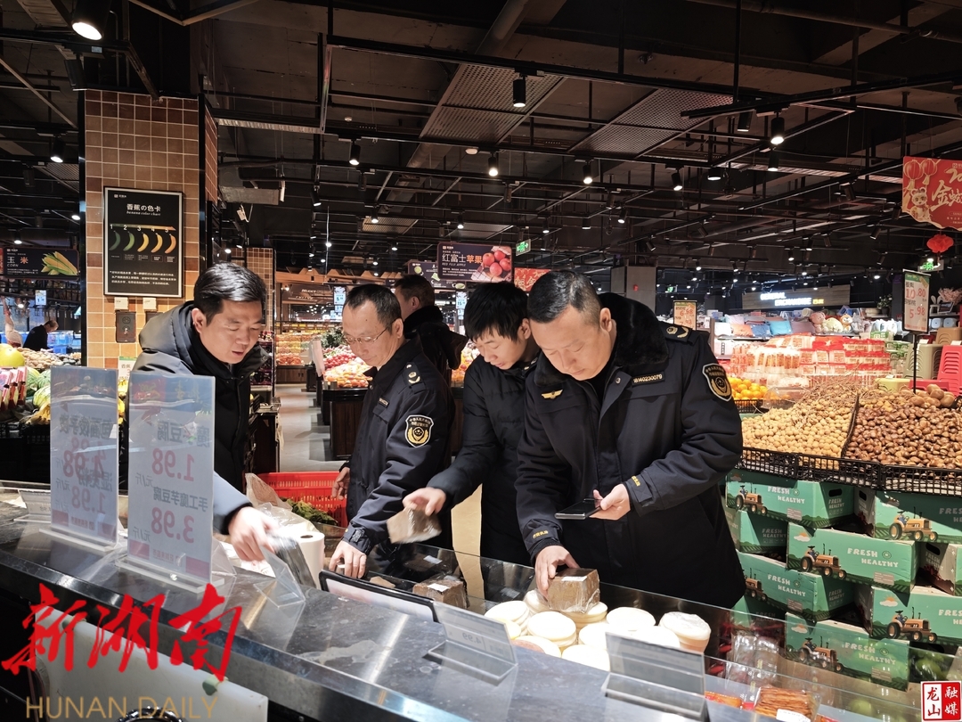 在龙山县好利来超市,执法人员用计量器监测了电子秤是否标准。在生鲜时令区,都是保质期较短的食品,执法人员提醒其负责人要保障进货渠道、保质期、贮存条件、标签标识以及索证索票等情况,确保商品来源正规、质量合格,要按规定摆放价格牌,将临期产品和其他产品分区摆放,让消费者有足够的知情权。