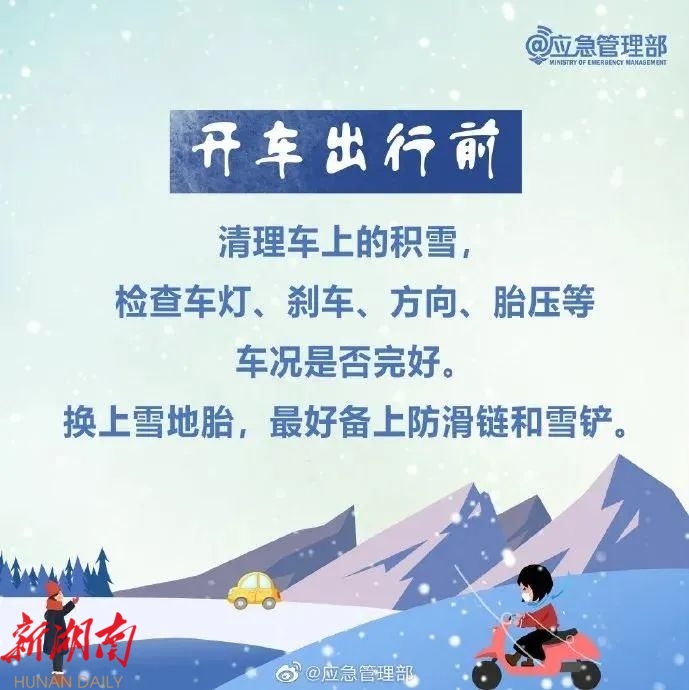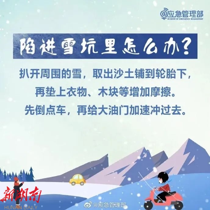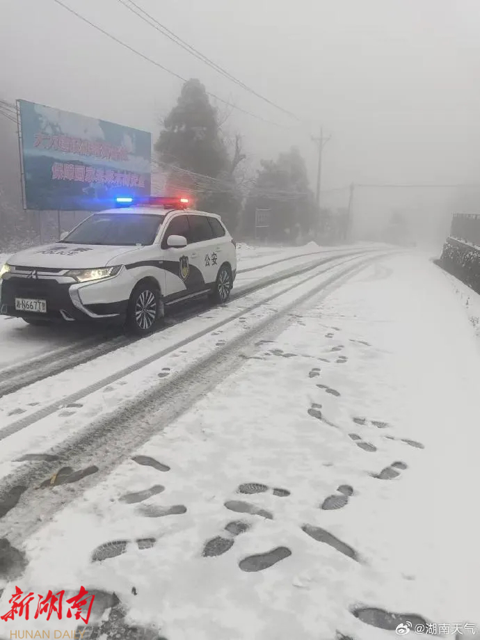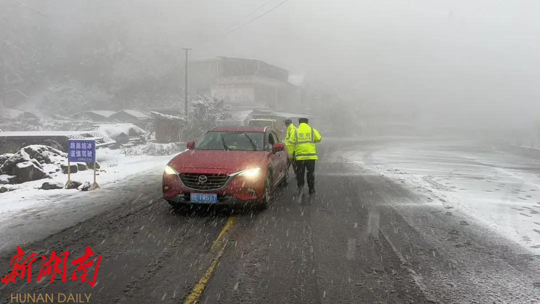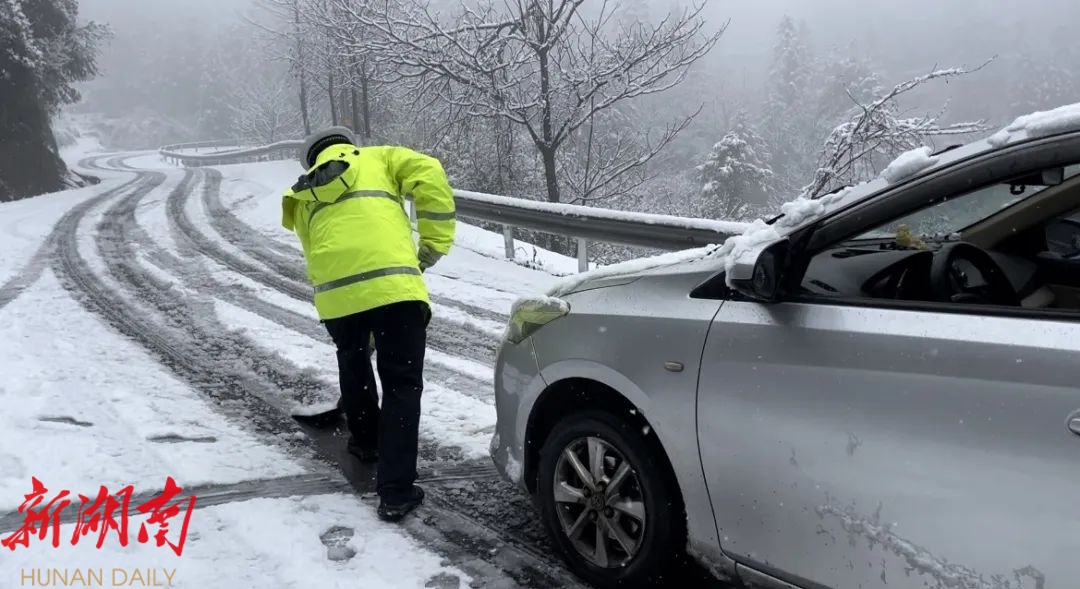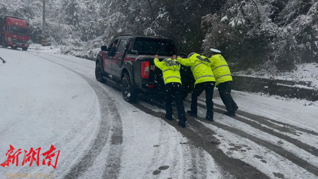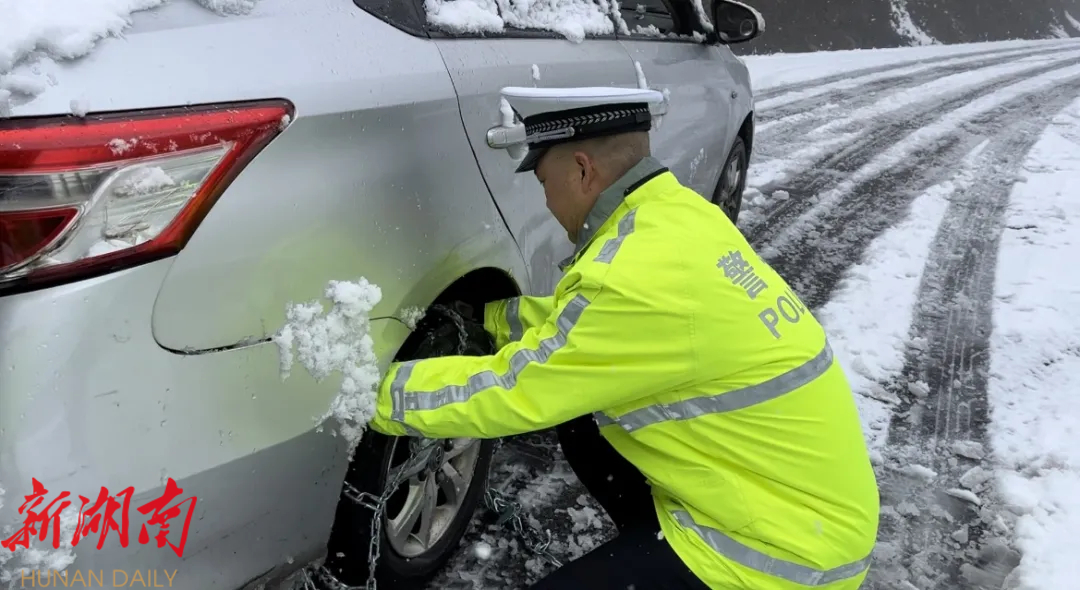 3、受冷空气影响洪江市境内雪峰山路段普降大雪,气温骤降。G320国道(怀化市-洪江市)洪江市雪峰镇至塘湾320国道雪峰山路段),受结冰影响交通管制。洪江市交警大队现已开展应急预案,携带救援工具展开 24 小时不间断巡逻,巡逻时遇到受困车辆 民警清理车轮附近的积雪,采取人推车拉的方式,全力救助被困车辆。并给车辆安装好防滑链护送至安全区域。