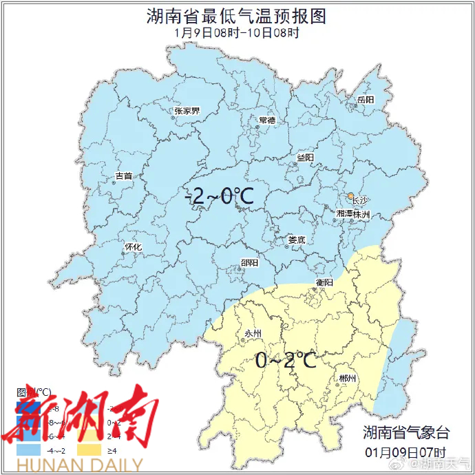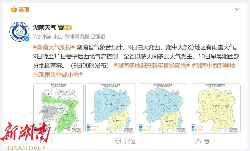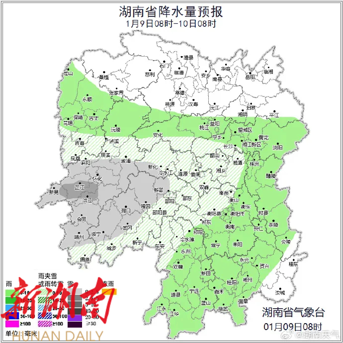 湖南省气象台预计,9日白天湘西、湘中大部分地区有雨雪天气。9日晚至11日受槽后西北气流控制,全省以晴天间多云天气为主,10日早晨湘西部分地区有雾。(9日08时发布)