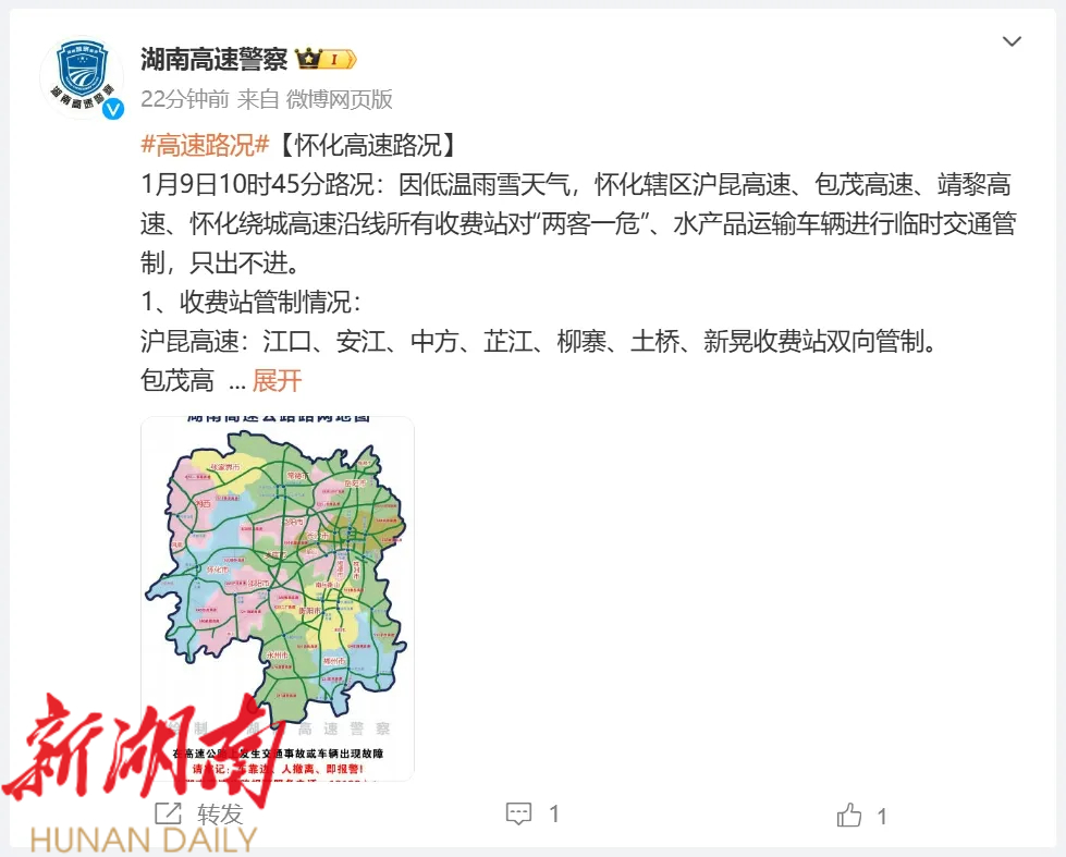 1月9日10时45分路况:因低温雨雪天气,怀化辖区沪昆高速、包茂高速、靖黎高速、怀化绕城高速沿线所有收费站对“两客一危”、水产品运输车辆进行临时交通管制,只出不进。