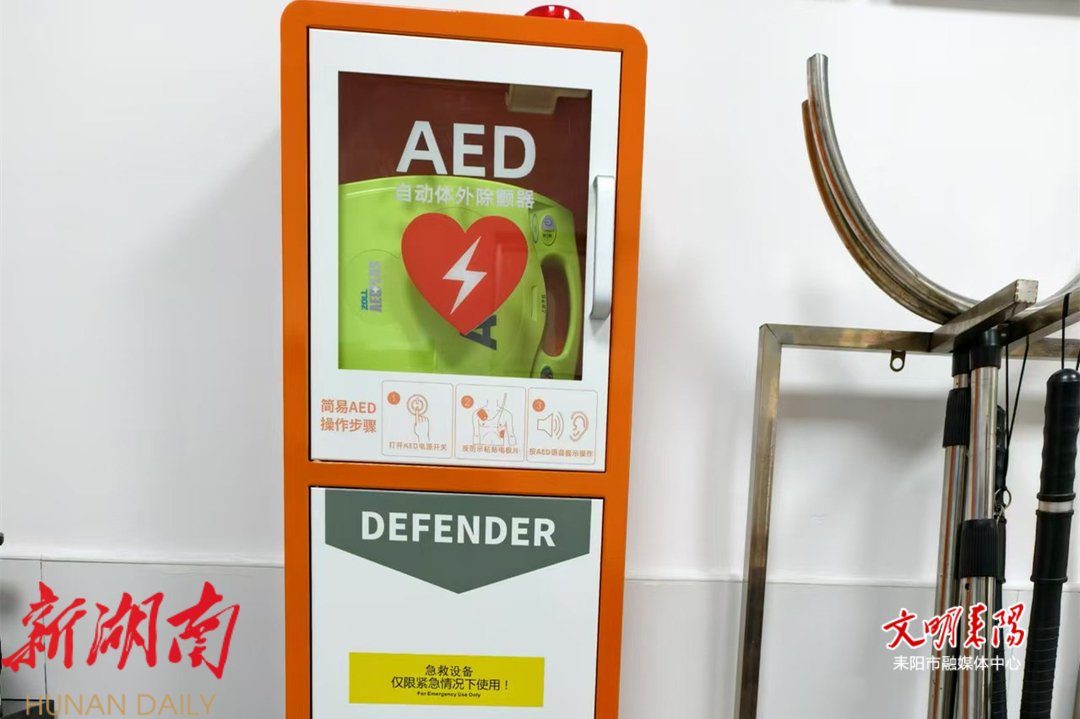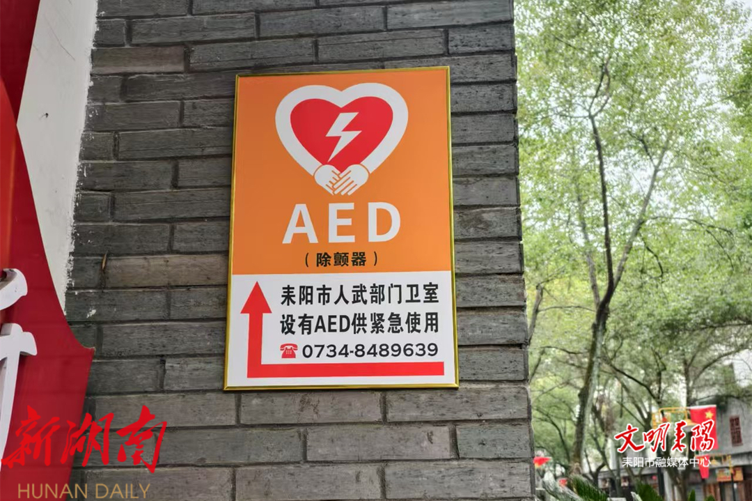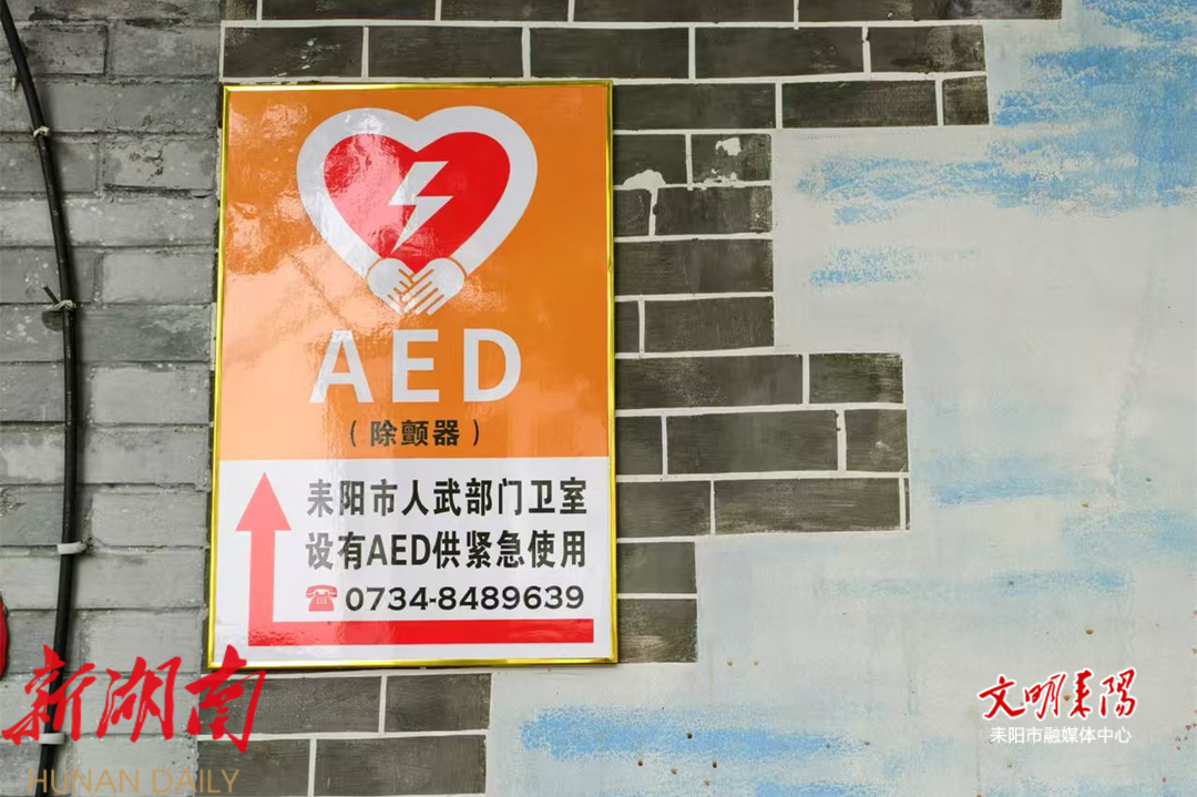 “这是昨天安装上的指示牌,前面路口和五一广场那边也安装了几个,真是方便了群众,这好像是我们耒阳市第一个配备AED(自动体外除颤器)并公开免费供市民紧急使用的机关单位。”一位正在晨跑路过的老大爷告诉记者。