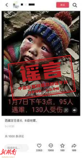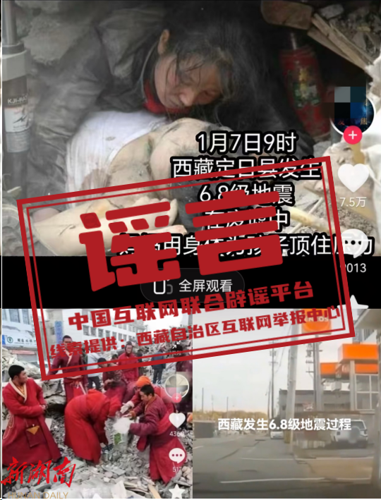 详情: 1月7日9时5分,西藏日喀则市定日县发生6.8级地震,震源深度10千米。目前,抢险救援各项工作正在加紧进行,震区隐患排查、群众避险安置、受损设施修复工作已全面开展。有部分自媒体为博眼球、蹭流量、吸引粉丝,利用网络旧图、AI智能技术等手段合成发布日喀则市定日县地震不实图片及音视频等信息,另有借地震发布非法集资募捐的谣言信息,严重误导网民。互联网不是法外之地,请大家保持理性思考,增强防范意识及信息甄别能力,不信谣、不传谣、不造谣。(来源:“西藏举报”微信公众号)