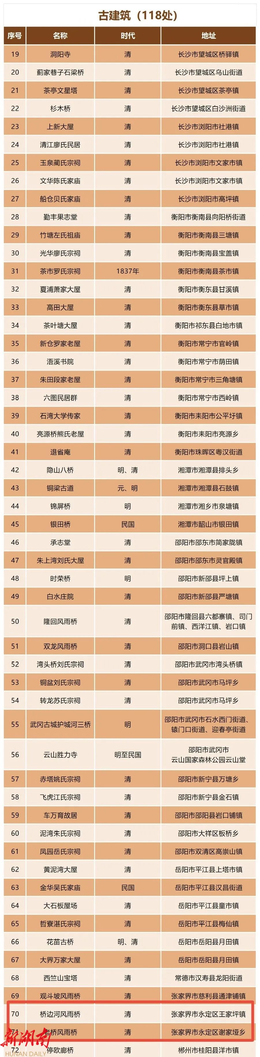 近日,湖南省人民政府印发了《关于公布第十二批省级文物保护单位名单的通知》,核定公布219处省级文物保护单位,永定区有2处名列其中,分别是王家坪镇桥边河风雨桥,谢家垭乡老桥风雨桥 。