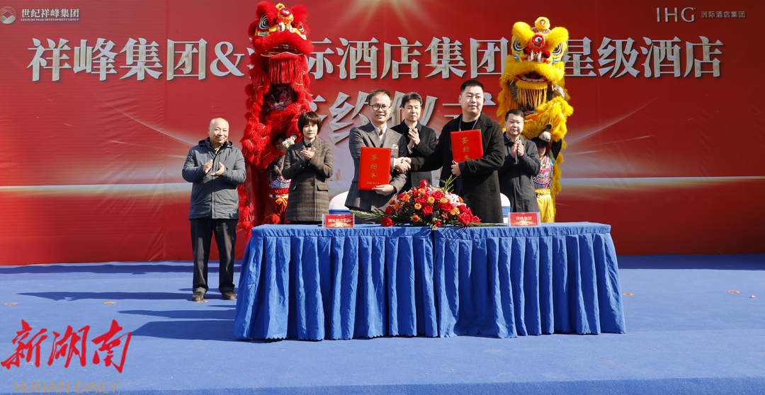 新石鼓客户端1月10日讯(通讯员 唐成 唐敏 罗亮华) 1月10日上午,衡阳市石鼓区虎形山片区重点项目祥峰酒店迎来建设新阶段,祥峰集团与洲际酒店集团举行签约仪式,携手打造城市新地标。市政府副市长谢宏,市政协一级巡视员许云生,市政府副秘书长郭建中、谢韬,石鼓区委书记、区长谢海蓉,祥峰集团董事长许刚丈见证签约。祥鸿置业董事长许少峰、洲际酒店集团副总裁张静兴代表双方进行签约。