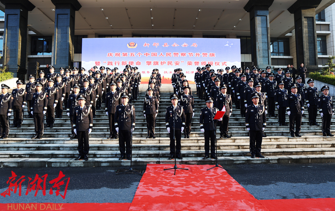 新新邵客户端1月10日讯 1月10日,新邵县公安局举行庆祝第五个中国人民警察节升警旗暨“践行新使命 擎旗护平安”荣誉颁授仪式,进一步激励全警以实际行动竭力守护一域平安,服务一方百姓,为我县经济社会高质量发展保驾护航。副县长、县公安局局长刘焕出席活动并讲话。