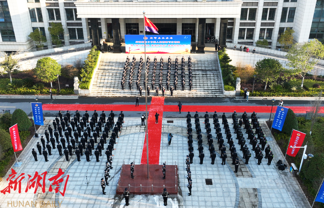 这天清晨,新邵县公安局200余名民辅警身着藏青色警服,列成三个方队秩序井然地伫立在局广场前坪,一个个身姿挺拔、精神抖擞,充分展现了人民警察良好的精神面貌。在首先举行的升警旗仪式上,护旗手迈着铿锵有力的步伐,昂首挺胸地护送警旗行至升旗台前。伴随着雄壮的《中国人民警察警歌》,承载着荣誉和使命、代表着忠诚和荣光的警旗冉冉升起,与初升的朝阳相映成辉。