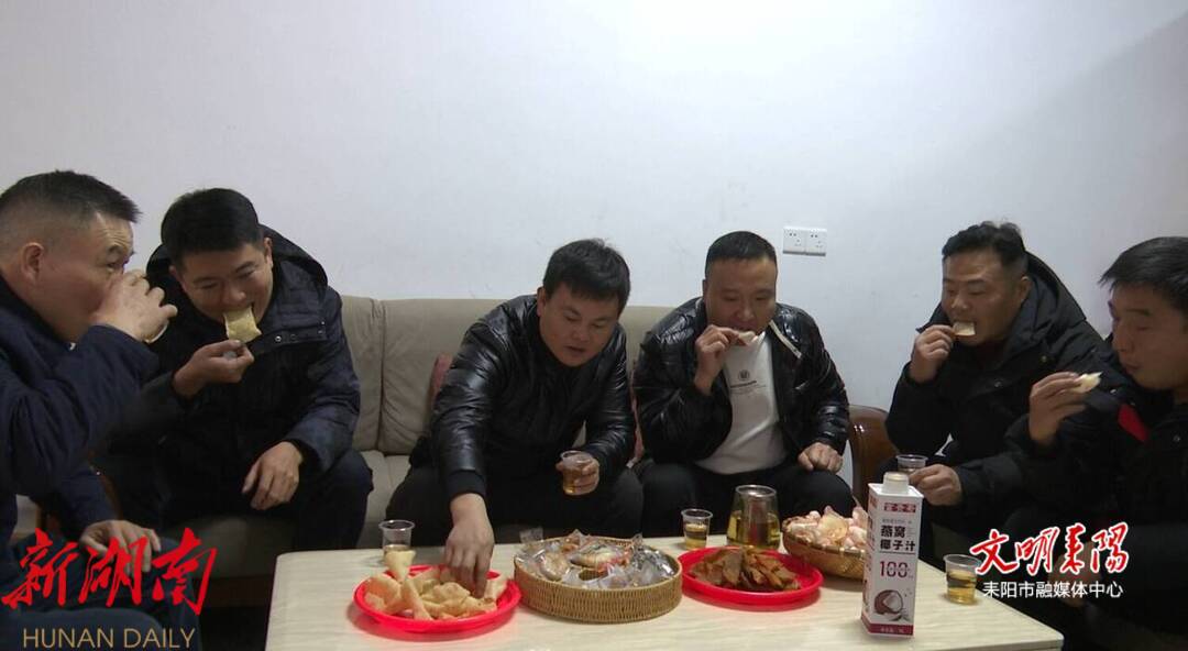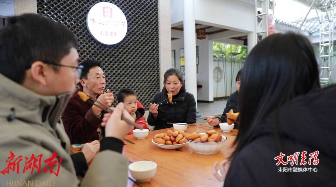 夏塘镇村民邱桂平家中此时也是火力全开,香飘四溢,只见她熟练地架起了油锅,将切好的水豆腐、红薯皮、糯米干片等依次放入油锅开炸。在柴火的热力加持下,油炸豆腐鼓胀饱满,寓意着新年富足,炸好的耒阳粑丝好吃“嘎嘣脆”。刚出锅的油炸小吃吸引来了左邻右舍一起围坐,大家品尝小吃、唠家常,画面既温馨又热闹。邱桂平说:“马上就要过年了,我们做一些手工年货用来招待客人,一起围着桌子,喝喝茶、聊聊天,感觉很有年味,这些也是我们祖祖辈辈传承下来的一个特别美好的年俗。”
