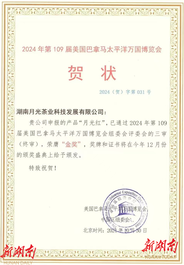 湖南日报·新湖南客户端1月12日讯(通讯员 伍震辉 康文德)在2024年第109届美国巴拿马太平洋万国博览会上,湖南月光茶业科技发展有限公司“月光红”红茶脱颖而出,荣膺金奖。新化红茶时隔108年,再次在巴拿马万国博览会上绽放光彩。