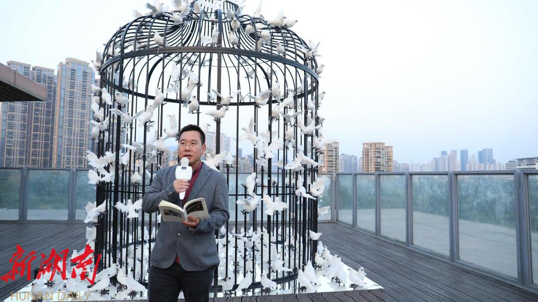 深圳诗人谢湘南在《开放的鸟笼》前读诗。