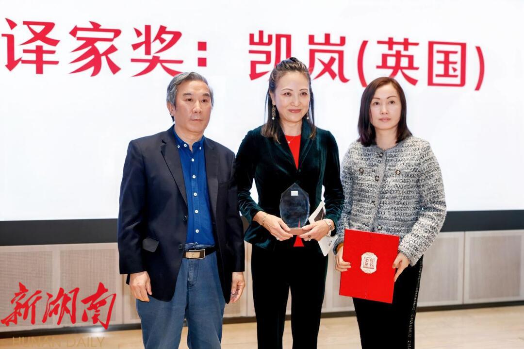 翻译家远洋(左)、诗人朱巧玲(右)给英国翻译家凯岚(中)颁奖。
