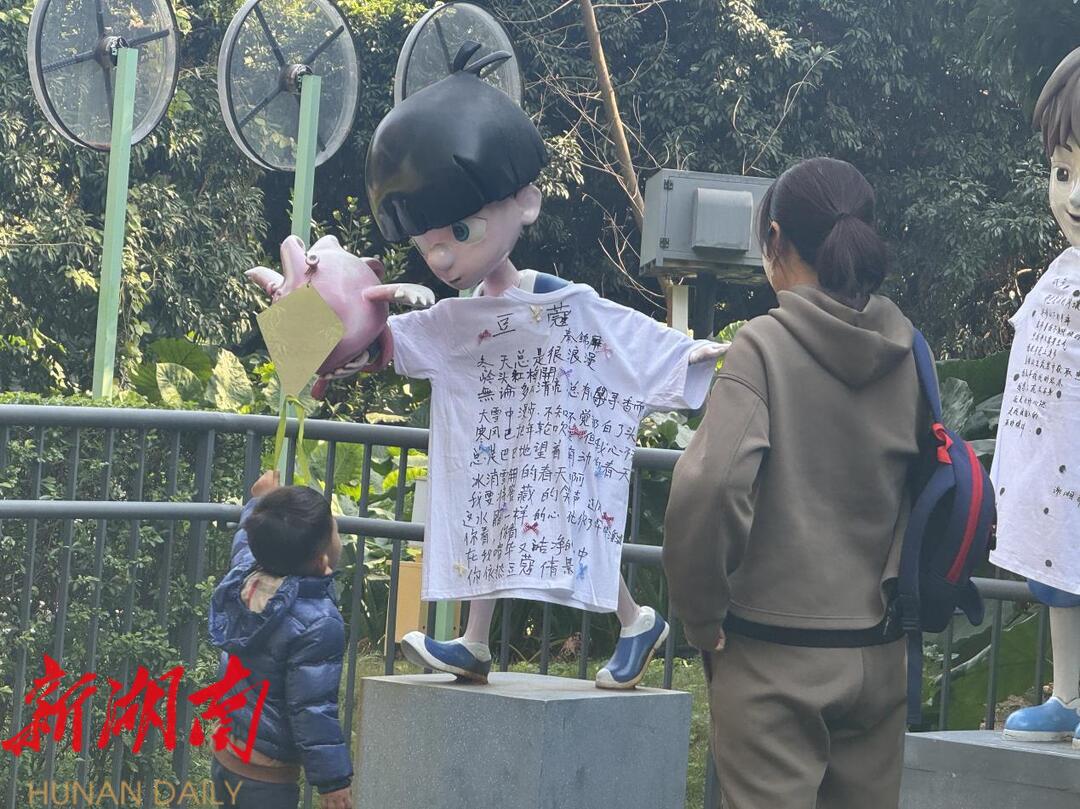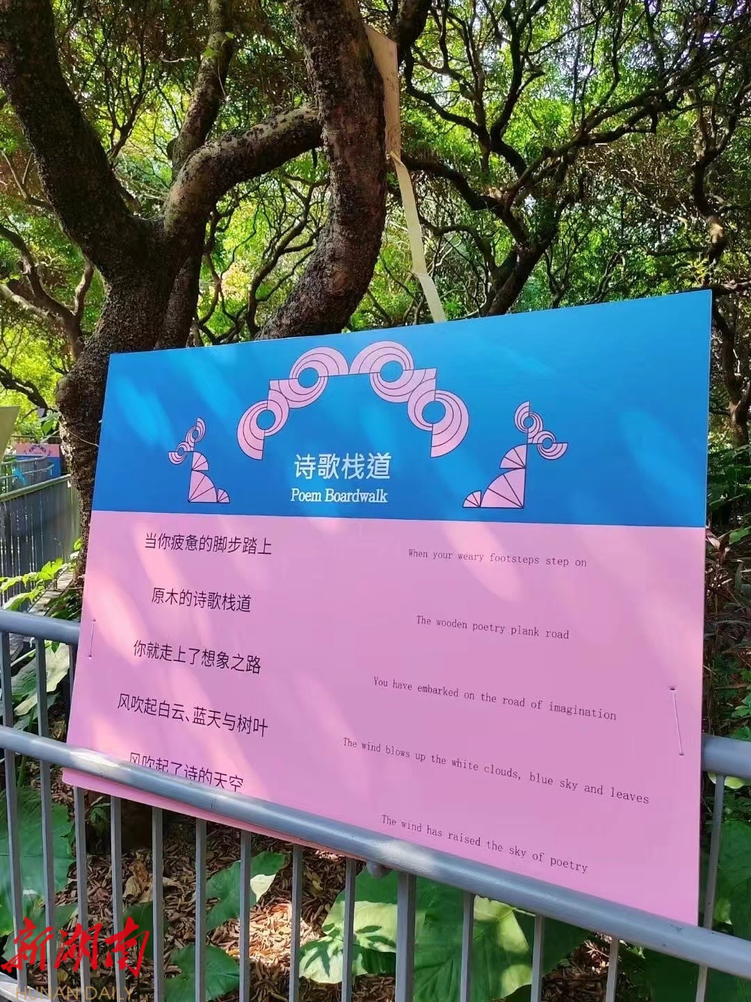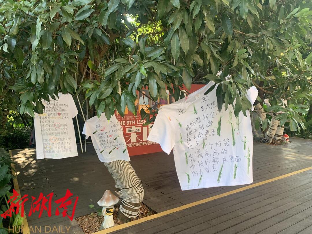 树叶、树杆、栏杆上挂满了聂鲁达、安德拉德、太阿、谢湘南、邱华栋、秦锦屏、周艺文、赵原、樊子、周瑟瑟、吴茂盛、阮雪芳、李国坚、吕布布、阿翔、朱熳青、零零、周朝、桂杰、宋楹、芦苇、王志贤、沈璐容等诗人的诗,以及姜二嫚、铁头、朵朵、朱雨晗、王清扬、王星允、王星捷、海菁、何筱柚、朱洪恩、李芊墨等孩子的诗。