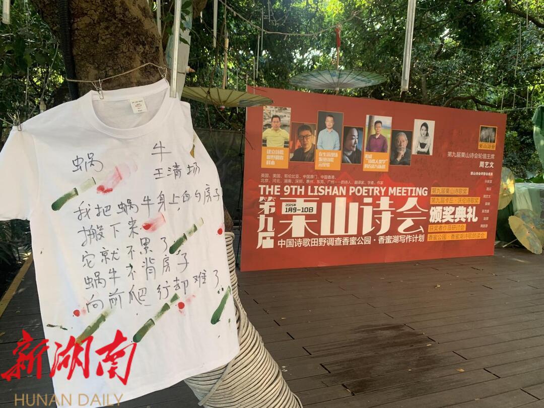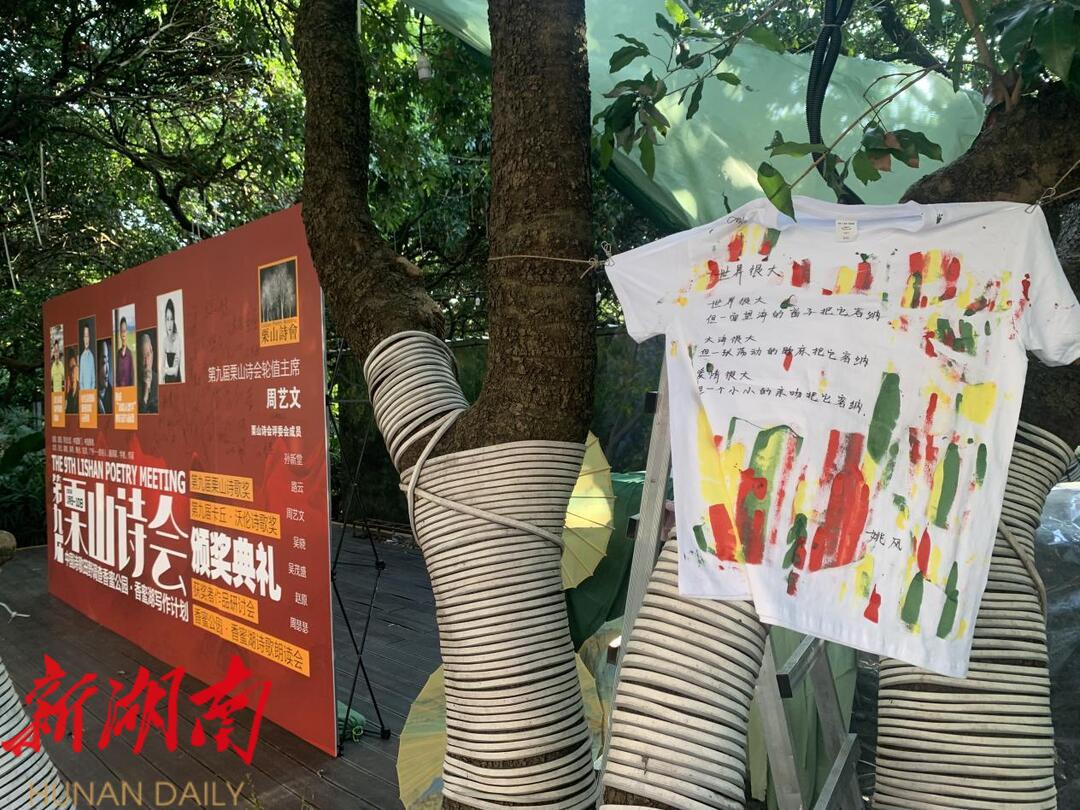 在有深圳最美“森林图书馆”之称的深圳福田区儿童图书馆香蜜分馆,诗人们在图书馆前荔枝树上挂的白色T恤上写诗,诗句随风飘扬。 图书馆四周布置的周艺文童话作品里的人物雕塑,也穿上了写满诗歌的白色T恤。沿着上坡的栈道,读者与游客被栈道两边的诗歌吸引住了,他们读到了3岁至17岁孩子的诗与本次获奖诗人、批评家、翻译家的诗。