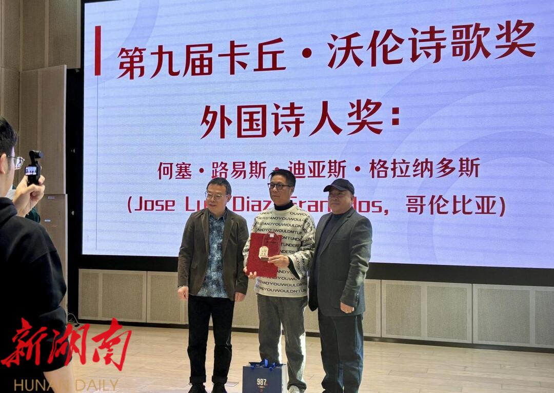 哥伦比亚作家联盟主席、诗人、作家何塞·路易斯·迪亚斯-格拉纳多斯获得第九届卡丘·沃伦诗歌奖外国诗人奖,他通过视频致答谢辞时说:“带着十二月的欣喜,我谨向评委会全体成员表达我真挚的感谢。我感到无比的激动、骄傲和高兴。卡丘·沃伦诗歌奖穿越千里,将传奇的中国与远在拉美的哥伦比亚连接,我获得这一奖项倍感荣幸。同时我也想向我的挚友,中国翻译家、文化活动家孙新堂教授致以由衷的感谢。我六十余年的文学生涯中,感谢孙新堂先生对我的鼎力推荐,也感谢孙新堂先生将我的诗歌带进了中国的文学世界。”