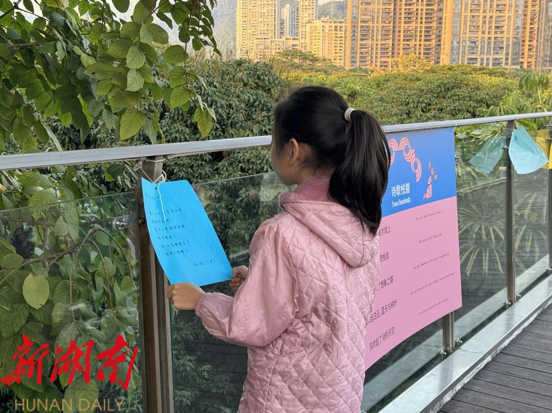 深圳高级中学中心校区的学生放学后也跑来读诗,“在书上读诗与在树叶上读诗是完全不一样的体验,我更喜欢树叶上的诗。”赵旷野同学说。