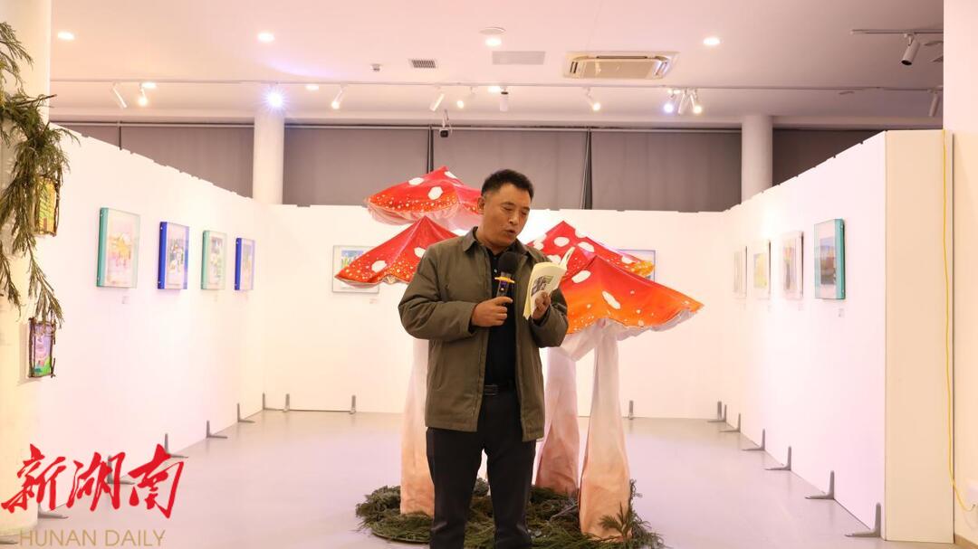 惠州诗人仲诗文在“第二届深港少儿美术作品展”展厅读诗。