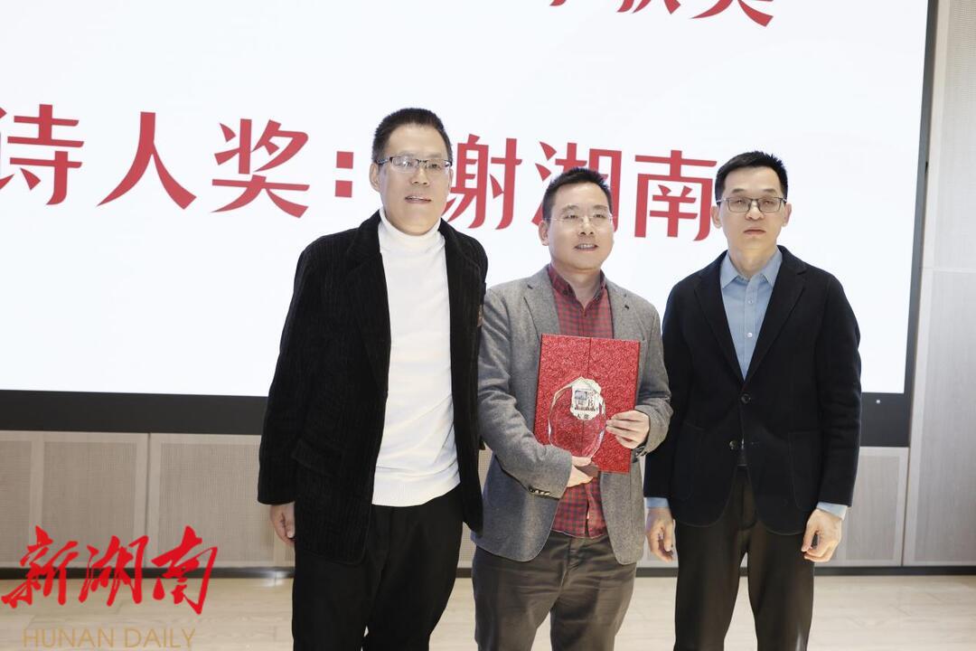 诗人樊子(左)、周瑟瑟(右)给太阿(中)颁奖。