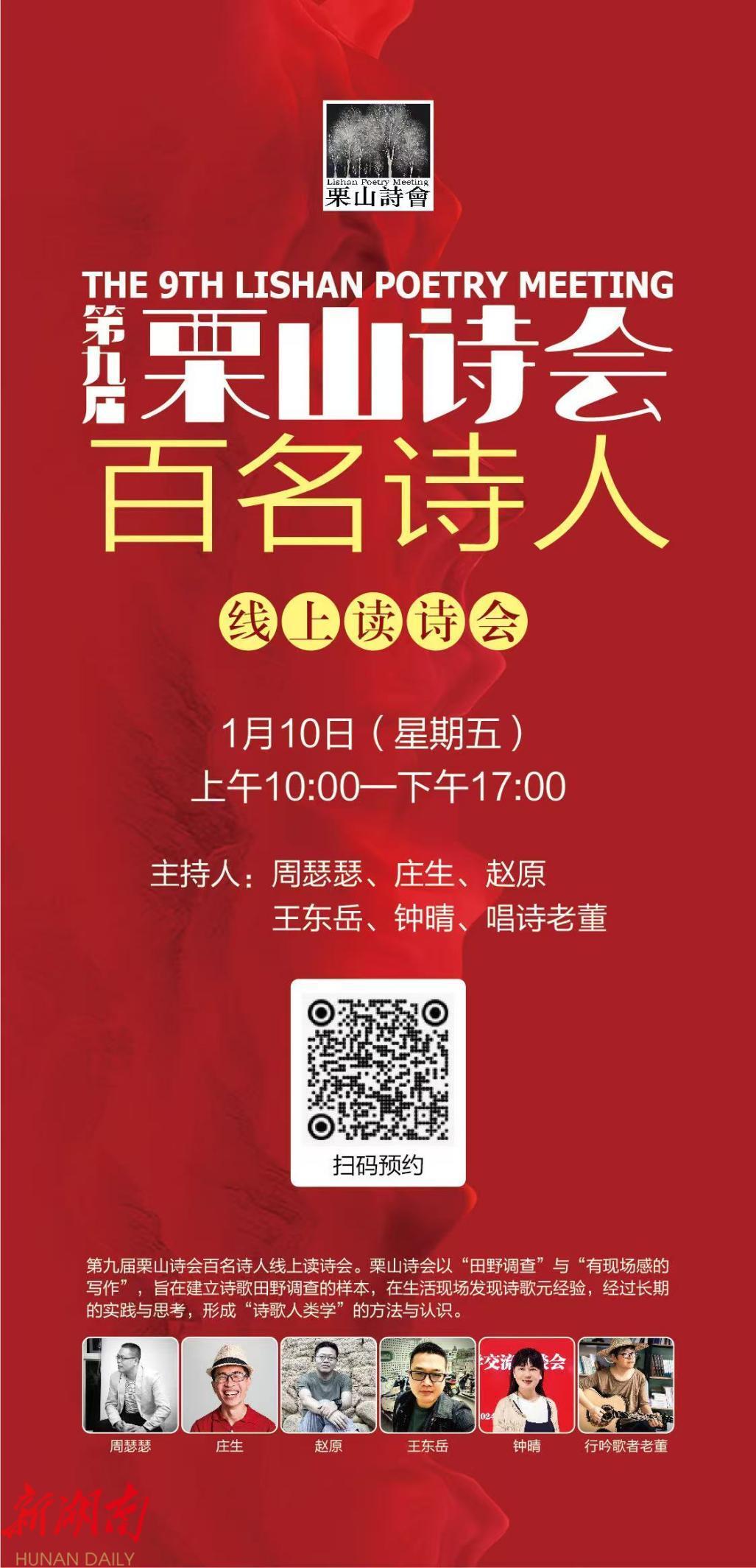 10日,全天进行了第九届栗山诗会百名诗人线上读诗会,读诗嘉宾分为4组进入腾讯公议室读诗,通过艺术家周艺文视频号直播。诗人周瑟瑟、庄生全程主持,并在直播间评点诗人们的作品。