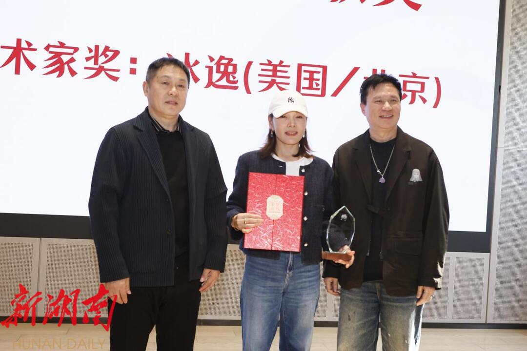 诗人施浩(左)、当代艺术家周艺文(右)为旅美当代艺术家、诗人冰逸颁奖,诗人宋楹(中)代领。