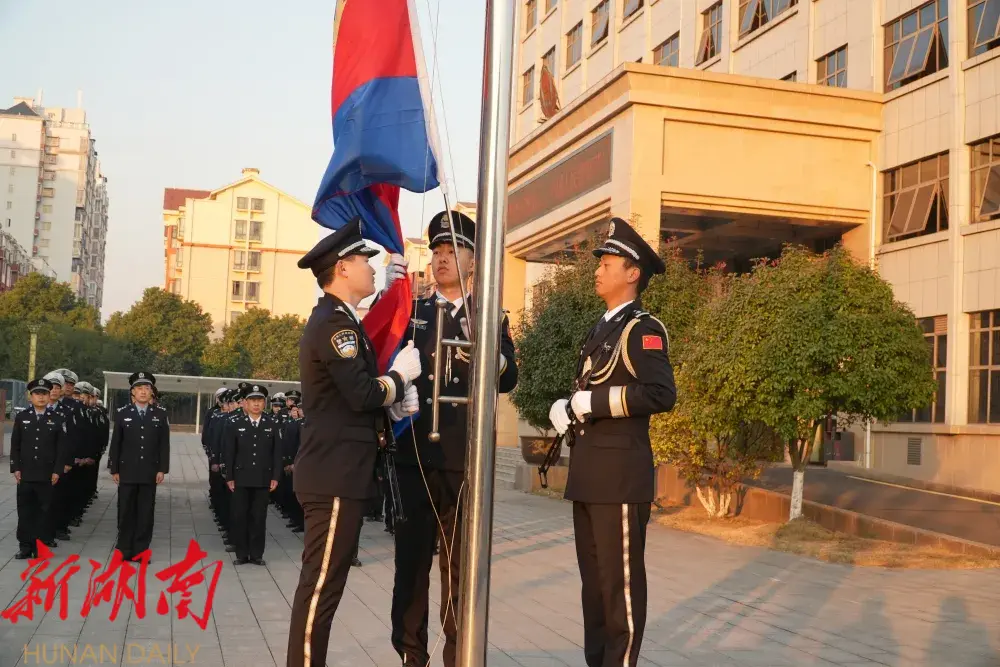 仪式现场,全体民辅警整齐列队,三名礼兵护卫着警旗正步走向升旗台,随着激昂的警歌奏响,警旗在全场的目光中缓缓升起,全体人员肃立,向警旗庄严敬礼。