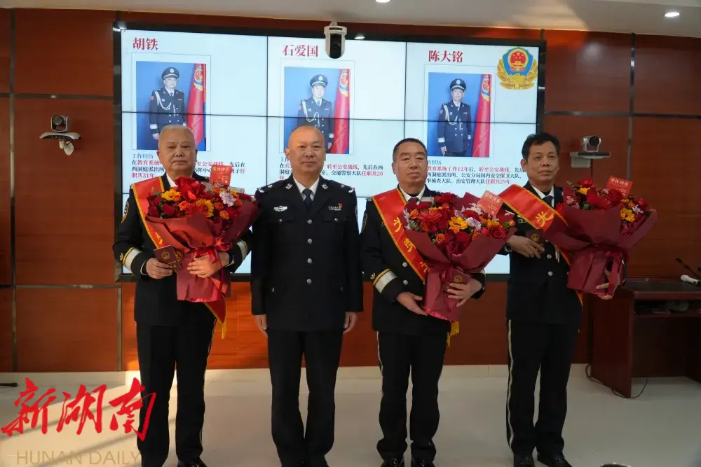 升旗仪式活动结束后,在会议室举行了退休民警荣誉仪式。蔡军为胡铁、石爱国、陈大铭三位依次颁发了退休证书和鲜花,龙韬为胡铁同志颁授从警三十年荣誉,并举行薪火相传授旗仪式。蔡军勉励全体青年民警继承和发扬优良传统,为公安事业再立新功。