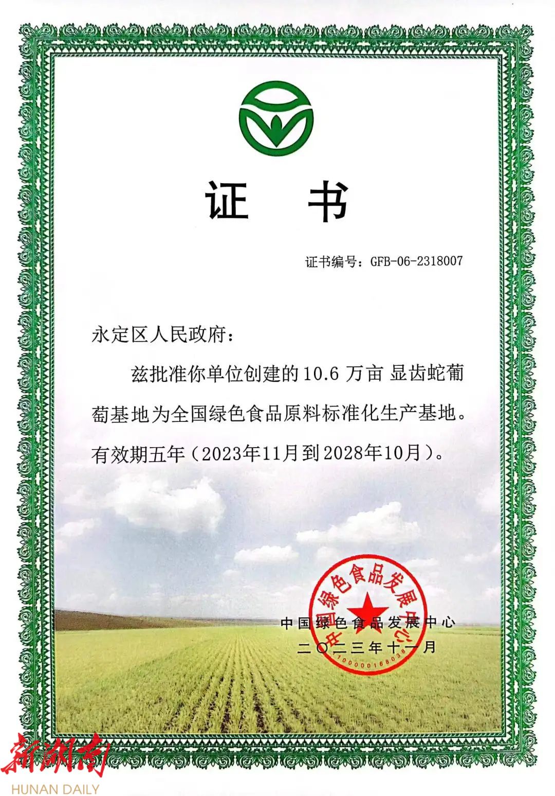 2021年张家界莓茶在中国国际农交会获得“中国最具影响力农产品品牌”的荣誉。2022年张家界神州界农业产业开发有限公司、张家界鑫林生物科技有限公司莓茶产品分别获得第七届亚太茶茗大奖金奖、银奖,永定区获得了阿联酋迪拜世博会中华文化馆首届宝船国际茶文化节“中国魅力茶乡(茶旅融合)奖金奖”。2023年永定区被中国绿色食品发展中心授予“第二十六批全国绿色食品原料(显齿蛇葡萄)标准化生产基地”。