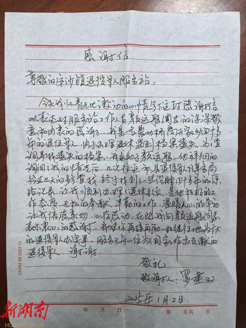 湖南日报·新湖南客户端1月17日讯(通讯员 阮霖浩 颜运聪)日前,家住长沙县安沙镇鼎功桥村的罗建武带着一封千里之外的感谢信,和一面写有“真诚服务退役军人,彰显军民鱼水情谊”的锦旗,送到了安沙镇人民政府,感谢退役军人服务站的工作人员帮弟弟罗建双查找到43年前的档案资料,使其得以顺利退休。