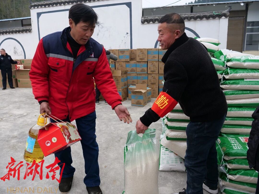 当天,张家界绿航果业公司还为岩壁村捐赠了5万元的物资,村两委人员向村民发放了米、面、油等过年所需的生活物资。