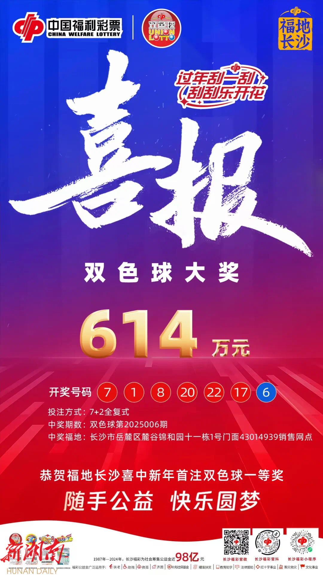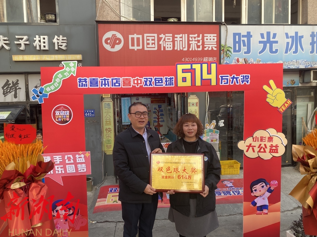 湖南日报·新湖南客户端1月19日讯(通讯员 李茜茜)鸿运当头,新年首开大奖。1月14日,中国福利彩票双色球第2025006期开奖结果揭晓,位于长沙市岳麓区麓谷锦和园十一栋1号门面的福彩43014939销售网点传来喜讯,该店一位幸运彩友喜获当期双色球一等奖1注及其他奖级若干,合计中奖金额高达614万余元。