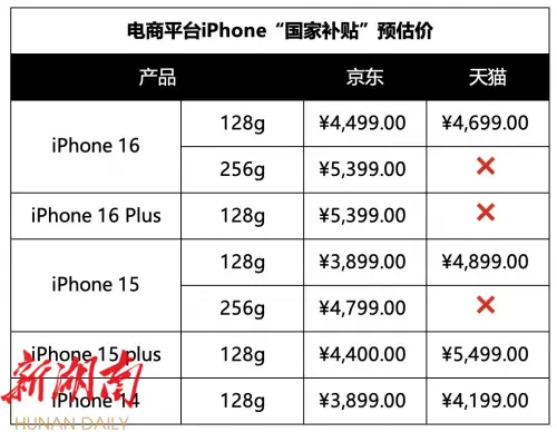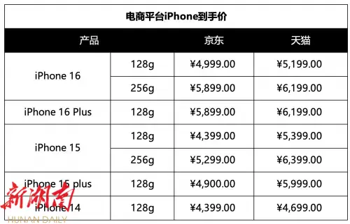 以128G的iPhone 16为例,京东价4999元,享受“国家补贴”15%优惠再减500元,最终到手价为4499元。天猫价5199元,使用国家补贴后的价格预估是4699元。 此外,根据国家补贴规则,“消费日报”预估了两大平台iPhone到手价,具体的到手价还需等明日见分晓。