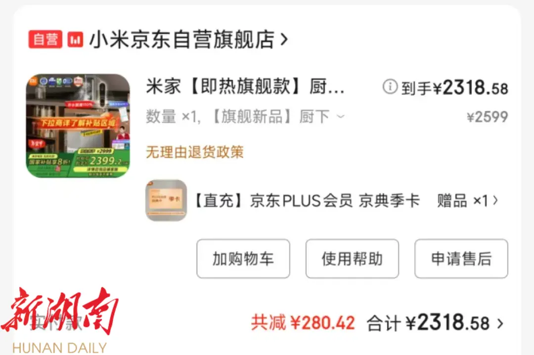 自2024年8月26日以来,北京、广州、上海、浙江、四川等全国20余地的以旧换新政府补贴活动陆续在京东上线。 消费者刘先生称,在“国补政策”出台前,2024年6月17日,他在“小米京东自营旗舰店”购买了一台净水器,定价为2599元,在使用各种优惠券后, 实付2318.58元。
