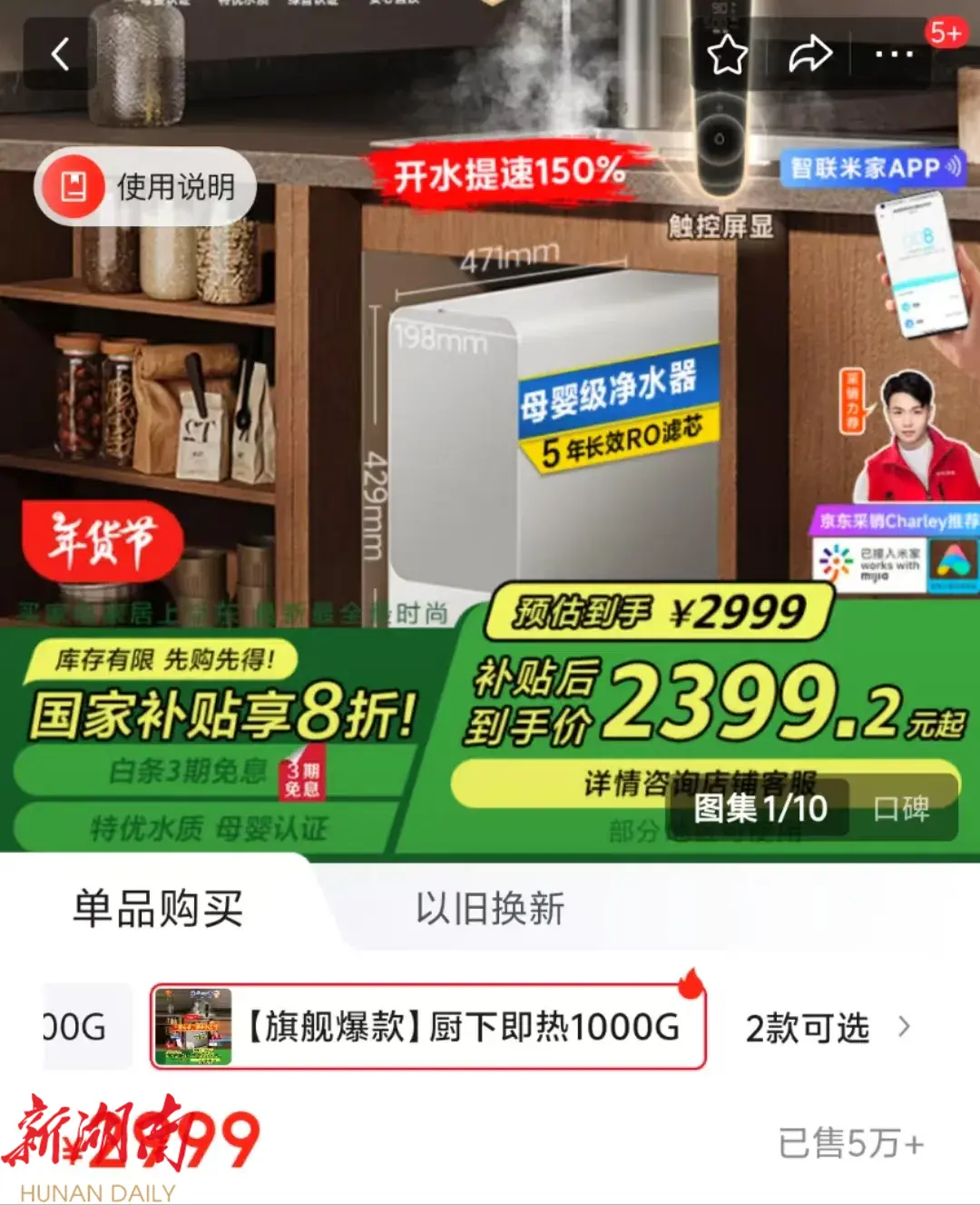 现在,这台净水器被列入国家补贴的商品范围,但它的价格涨了。 同样是这家小米京东自营旗 舰店,同样的产品规格(厨下即热、1000G),刘先生购买时的定价为2599元,而现在的定价为2999元,涨了400元,涨幅约为15.39%。