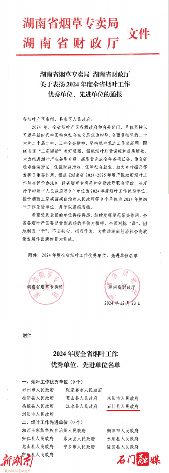 湖南日报·新湖南客户端1月20日讯(记者 易姣妃)近日,经省烟草专卖局和省财政厅联合评价,决定授予全省9个单位为2024年度烟叶工作优秀单位,并在2025年全省烟叶工作电视电话会议上予以通报表扬,其中,石门县人民政府为常德市唯一获评该荣誉的区县。