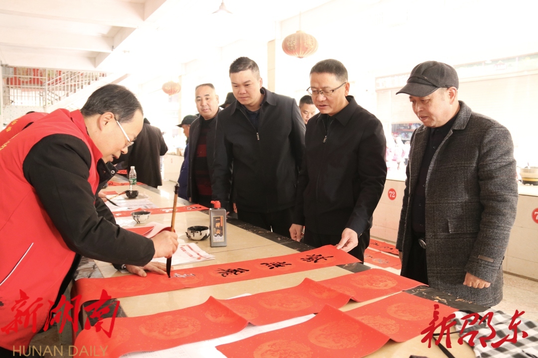 新邵东客户端1月20日(记者 刘意忠) 1月19日,邵东市文联带领市楹联家协会、市书法家协会、市花鼓剧团的文艺志愿者走进野鸡坪镇,开展“戏曲下基层、春联送万家”活动,为当地群众带去丰盛的文艺大餐,送上新春的美好祝福。