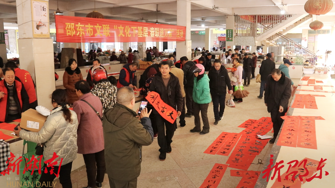 当天上午,在野鸡坪镇农贸市场,书法家就地取材,以摊点为桌,铺纸泼墨,书写春联。志愿者的红马甲和大红春联相映成趣,成为市场一道亮丽的风景,吸引了来往群众的目光。大家纷纷围到春联书写点,从《邵东楹联·春联特刊》上选择自己心仪的春联,邀请自己喜欢的书法家书写,然后小心地把写好的春联放到地上晾晒。地上的春联越来越多,整个农贸市场洋溢着喜庆祥和的气氛。