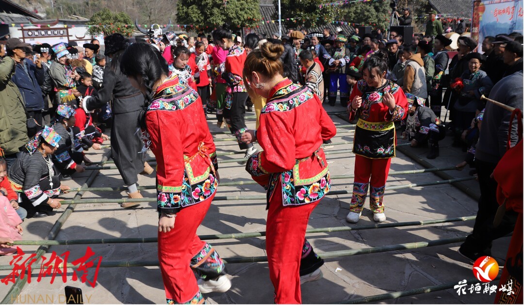 在热闹非凡的迎宾鼓舞声中,活动正式拉开序幕,一场丰富的文化民俗盛宴接踵而至。村民们积极参与表演,他们自导自演的节目充满地方特色。《苗家拜年》节目率先登场,大妈们身着传统的苗族服饰,用农村生活中的日用品为道具演绎出苗家新年的美好祝愿;苗族绝技《纸上飞仙》精彩非凡,表演者在薄薄的纸张上展示惊险技艺,观众们不时发出惊叹声;《踩铧犁》绝技表演更是彰显出苗族人民的英勇无畏,让人为表演者的勇气折服。
