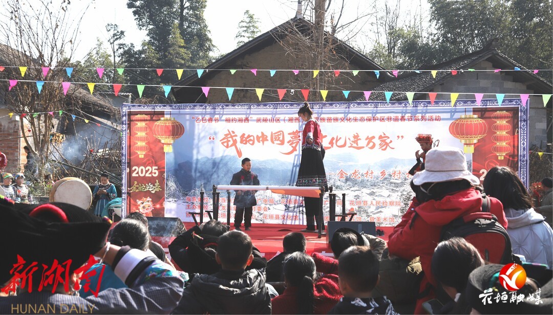 1月19日,“乙巳春节 相约湘西”武陵山区(湘西)土家族苗族文化生态保护区非遗春节系列活动之“我的中国梦 文化进万家”--金龙村乡村“村晚”在双龙镇金龙村非遗广场盛大开幕。金龙村及周边村寨的群众齐聚一堂,共享这场盛大的活动。