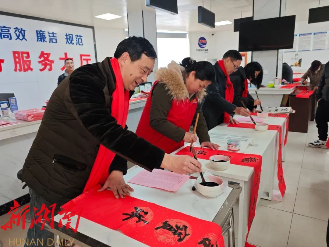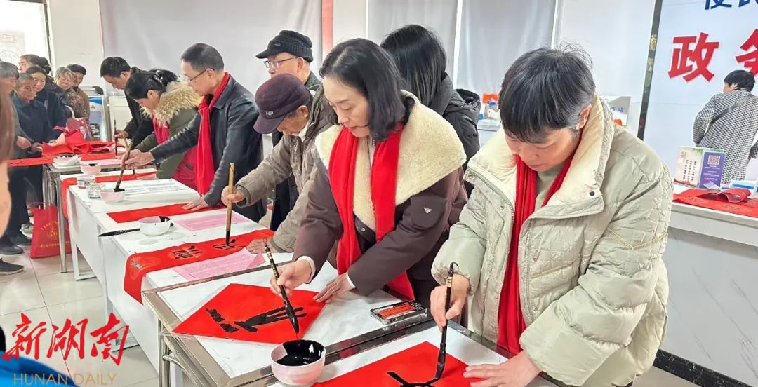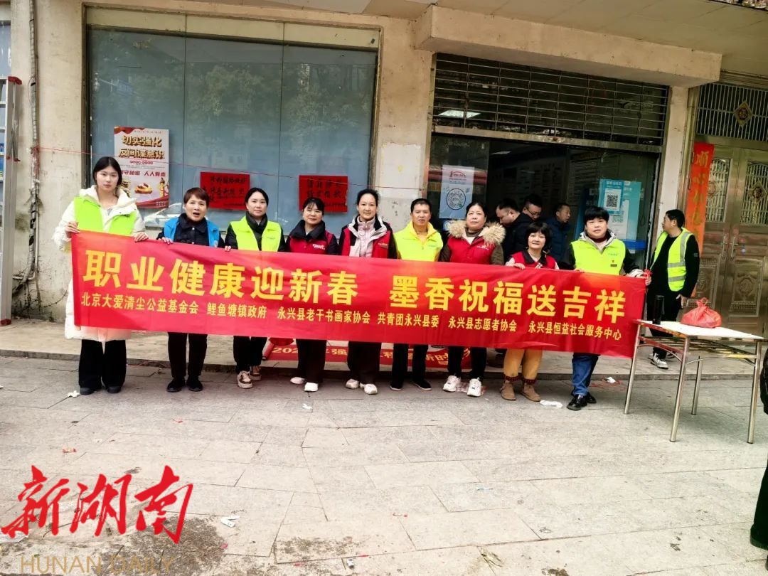 湖南日报·新湖南客户端1月20日讯(通讯员 郭军 郭泉中)1月18日,永兴县志愿者协会携手县老干书画家协会在鲤鱼塘镇开展了一场别开生面的”回家乡话尘肺”之“职业健康迎新春,墨香祝福送吉祥”活动。此次活动尘肺病健康知识与传统文化相结合,为当地群众带来了一场暖心的文化盛宴。