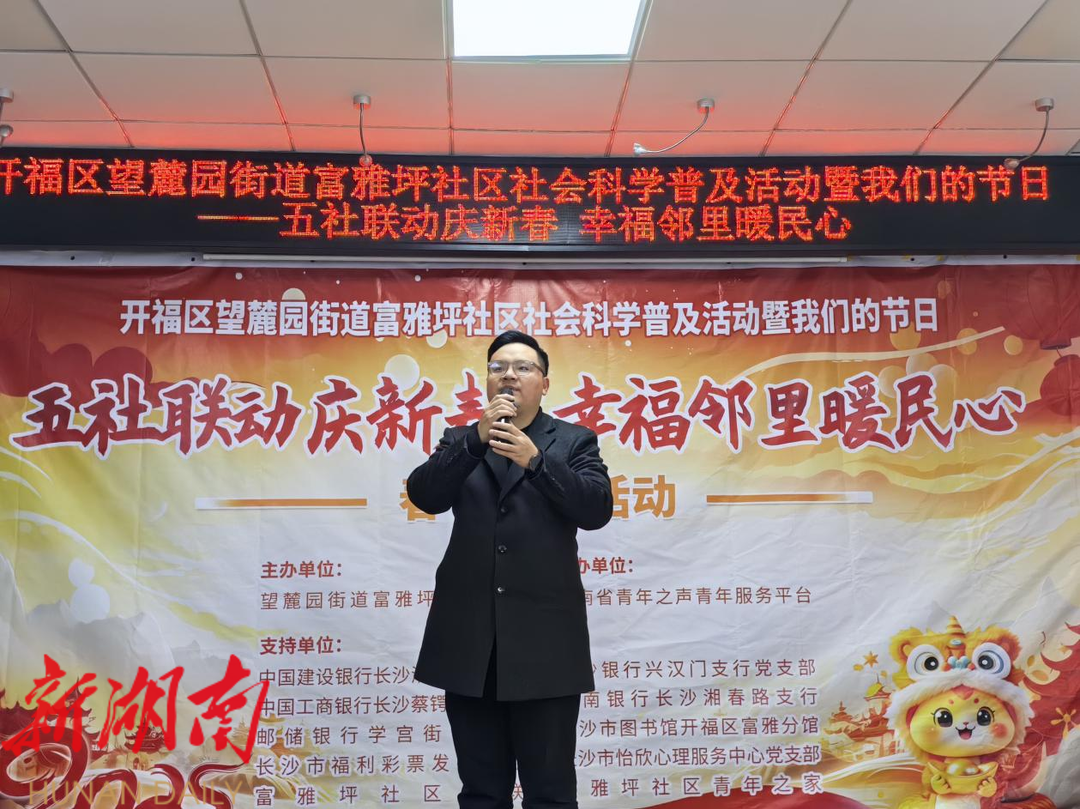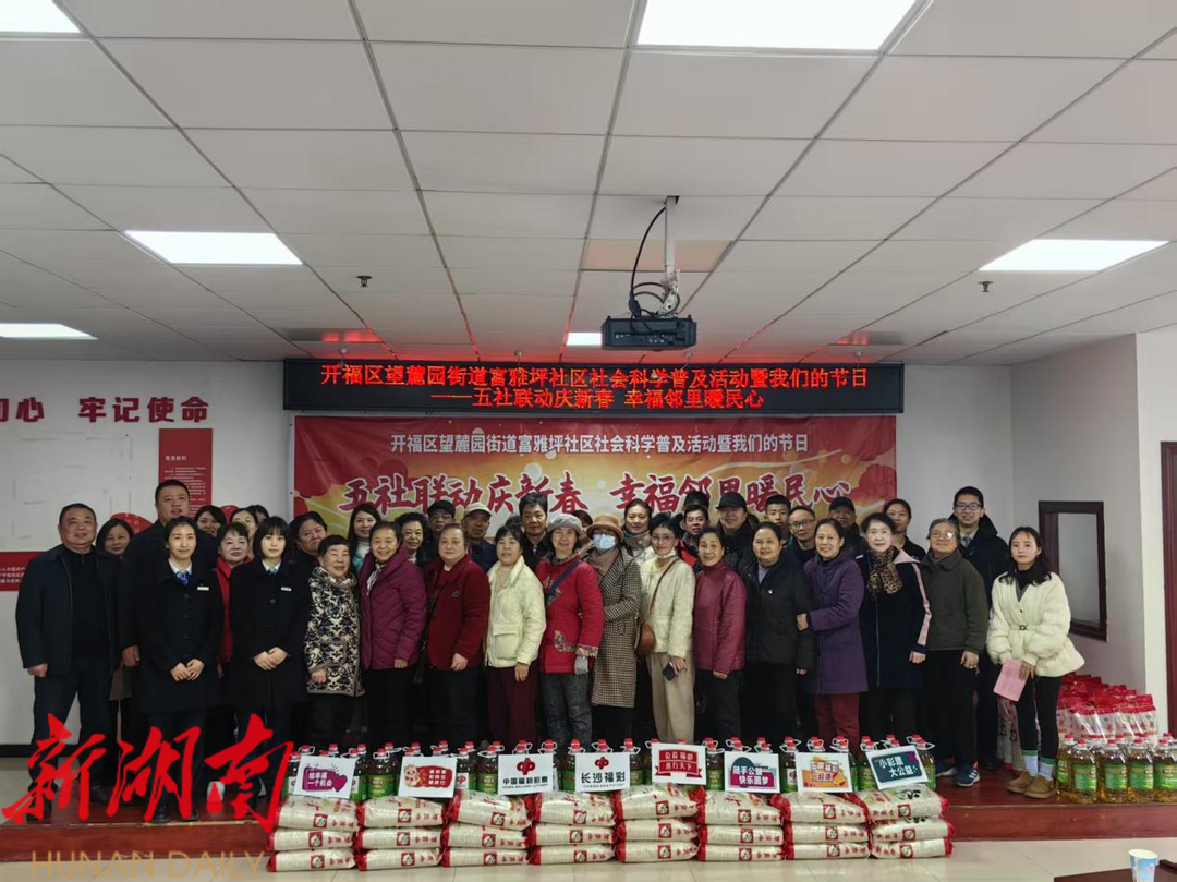 湖南日报·新湖南客户端1月21日讯(通讯员 朱秀云)为弘扬优秀传统文化,增添浓浓年味,提升社区凝聚力,丰富居民文化生活,营造新春佳节欢乐喜庆、文明祥和的浓厚氛围。1月21日,开福区望麓园街道富雅坪社区新时代文明实践站携手湖南省青年之声青年服务平台联合辖区五大银联单位和长沙市福利彩票发行中心共同举办社会科学普及活动暨我们的节日“五社联动庆新春 幸福邻里暖民心”春节慰问活动,党群邻里欢聚一堂、喜迎新春。