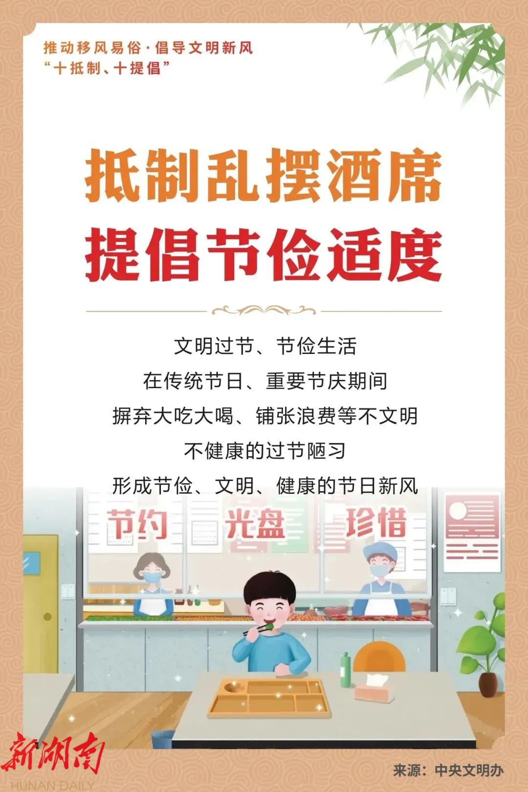 二、理性适度,节俭过年。 弘扬中华民族传统美德,理性消费,不讲排场、不比阔气,不铺张浪费,不盲目攀比;倡导文明、健康、节俭的餐饮习惯,外出就餐使用公勺公筷,尽量减少使用一次性餐具;积极践行“光盘行动”,珍惜粮食,按需点餐、文明用餐、剩餐打包,拒绝“舌尖上的浪费”,过一个“节俭年”。