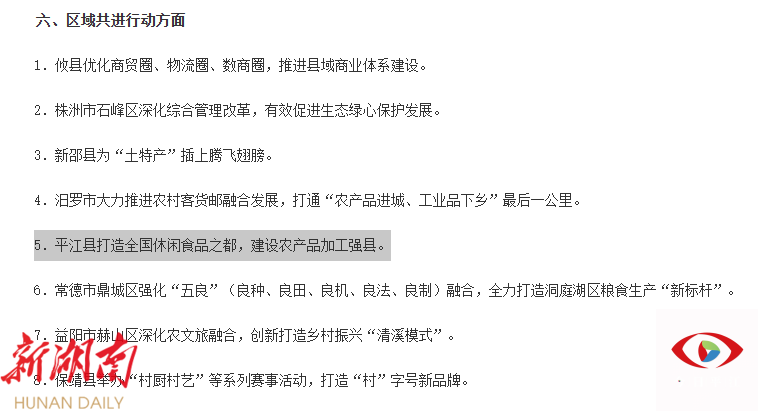 据了解,2024年12月中旬,省政府派出7个督查组分赴14个市州开展了实地督查。为表扬先进、宣传典型,进一步推动形成真抓实干、创先争优的良好局面,经省人民政府同意,湖南省人民政府办公厅对2024年度省政府推动高质量发展综合督查发现的70项具有代表性、典型性的典型经验做法予以通报表扬。 一起来看详情 👇👇👇 近年来,平江县锚定农产品加工转化主导型县定位,以打造全国休闲食品之都为重点,因地制宜、靶向发力。2023年获评全省县城经济高质量发展先进县。 实施“三项行动”