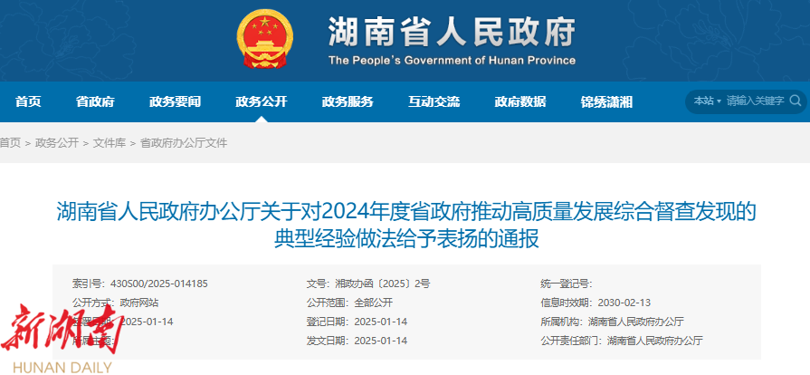 近日,湖南省人民政府办公厅