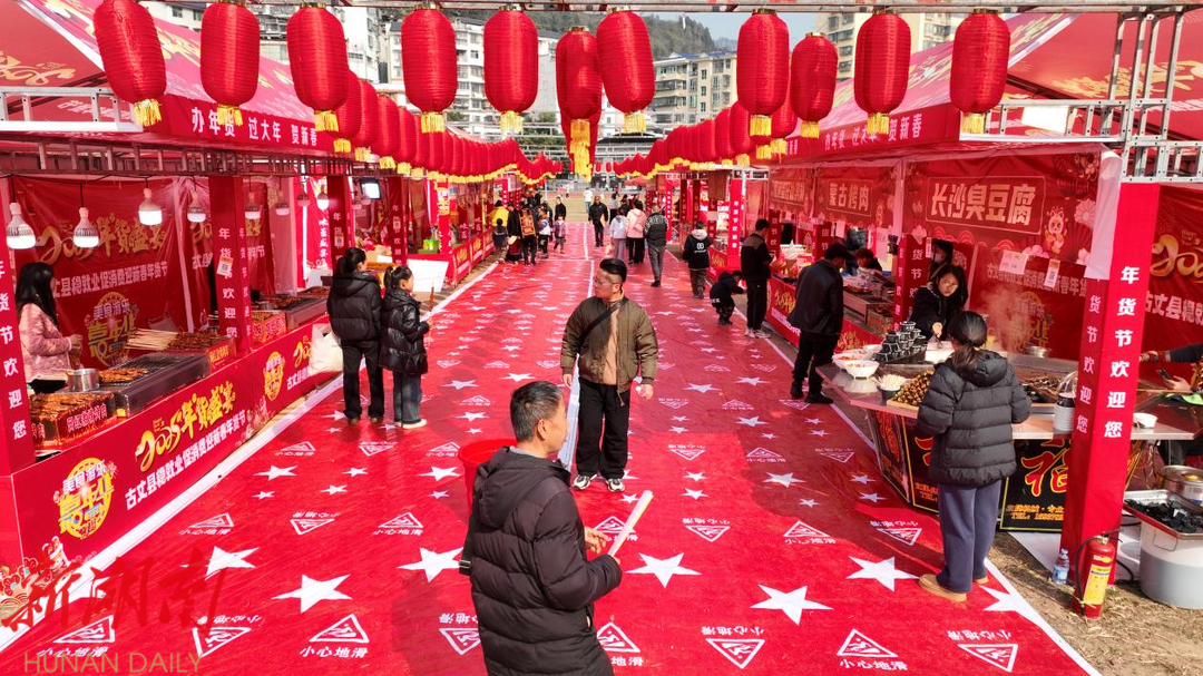 放眼年货展区,满目可见喜气洋洋的红色,特色商品琳琅满目,烟火气十足的美食摊位汇聚一堂,被群众围得里三层外三层。长沙臭豆腐、武汉热干面、烤肉炸串…热气腾腾的美食小吃引得人们纷纷在各个摊位前挑选、试吃并购入囊中。各类坚果、米面油、大礼包等年货商品也备受人们青睐。此外,还有生活用品、肉禽蛋奶、新鲜蔬果等丰富多样的产品供群众选择。