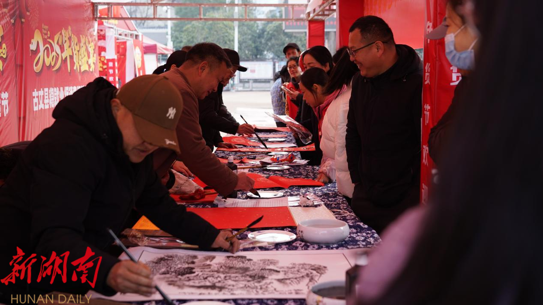 活动期间,还有三棒鼓、苗家八合拳、摆手舞、酉水船歌等文艺演出轮番上场,非遗展演打铁花、火壶在夜幕下震撼上演,“火树银花落,万点星辰开”,带来美轮美奂的视觉盛宴。书法家们铺展红纸,挥洒笔墨,给现场群众赠送免费的春联,传递节日祝福。全县人民在购年货时还可全天候享受丰富多彩的非遗文艺展演,体验春节民俗盛宴。