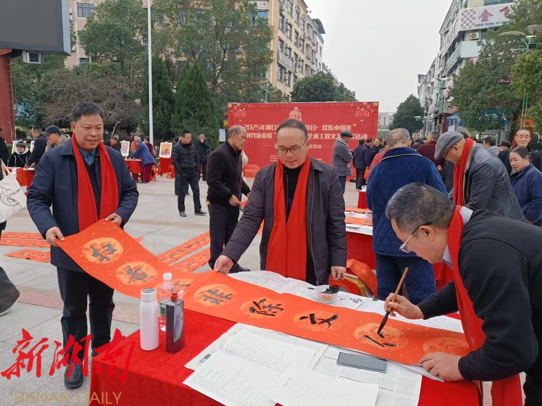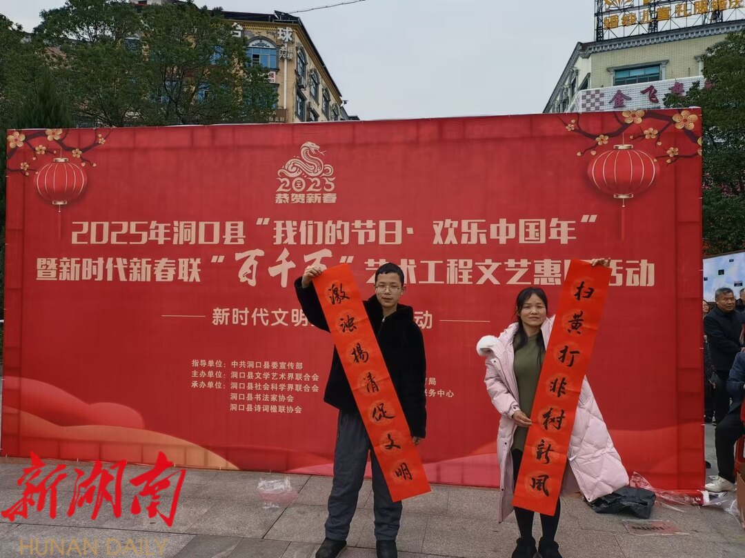 新洞口客户端1月22日讯(通讯员:刘德荣) 为深入贯彻落实党的二十届三中全会精神和习近平文化思想,提高群众对“扫黄打非”工作的认知度和支持度,弘扬中国传统文化,营造新春浓厚文化氛围,形成良好的社会文化环境,近日,洞口县委宣传部组织县文联、县社科联、县文旅局、县新时代文明实践服务中心等单位在雪峰广场开展2025年赏年画·送春联主题活动,为群众送去新春祝福和“扫黄打非”相关知识。