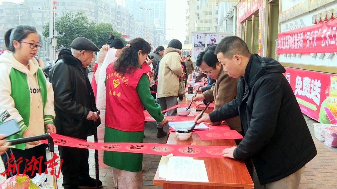湖南日报·新湖南客户端1月22日讯(通讯员 潘雁平 段姝)20日,冷水江市文联组织书法家协会的书法家们在信和广场挥毫泼墨,为市民送上满载祝福的春联,受到市民的热烈欢迎。