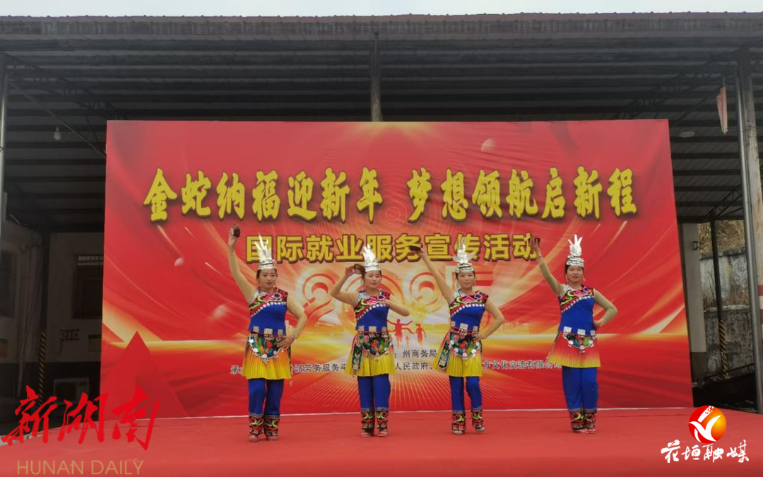 1月21日,由州商务局主办,州外派劳务服务平台、双龙镇人民政府等单位承办的“金蛇纳福迎新年 梦想领航启新程”国际就业服务宣传活动在花垣县双龙镇开展。活动通过国际就业宣传会议和文艺表演的形式向群众普及国际就业服务相关知识,提升村民对国际就业机会的认知和把握能力。