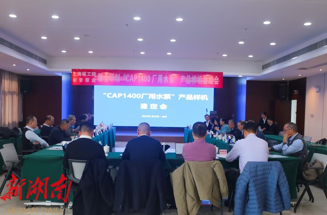 湖南日报·新湖南客户端1月22日讯(长沙经开区工作站记者 陈琪)1月20日,由中国机械工业联合会和中国通用机械工业协会组织的“CAP1400厂用水泵”产品样机鉴定会在湖南长沙顺利召开。会议由中通协会长黄鹂主持,专家组成员来自国家核电、中核工程、中广核、上海交大、国核示范站和三门核电等单位,专家组长由中机联原总工隋永滨担任。耐普泵业董事长耿纪中、总裁周红,上海核工院领导等出席会议。该泵由湖南耐普泵业股份有限公司和上海核工程研究设计院股份有限公司联合研制。